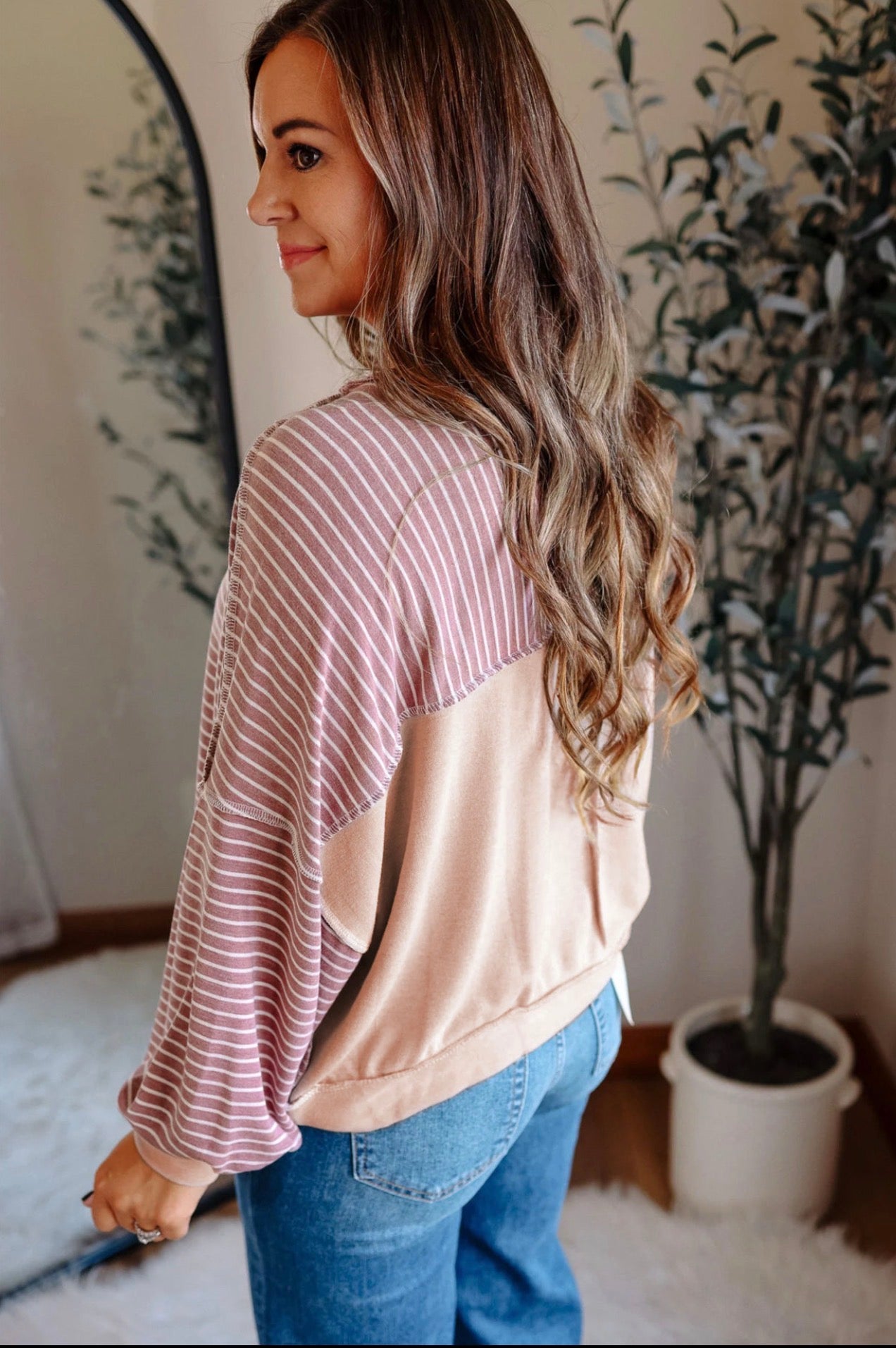 Striped long sleeve top adds a classic, casual style.