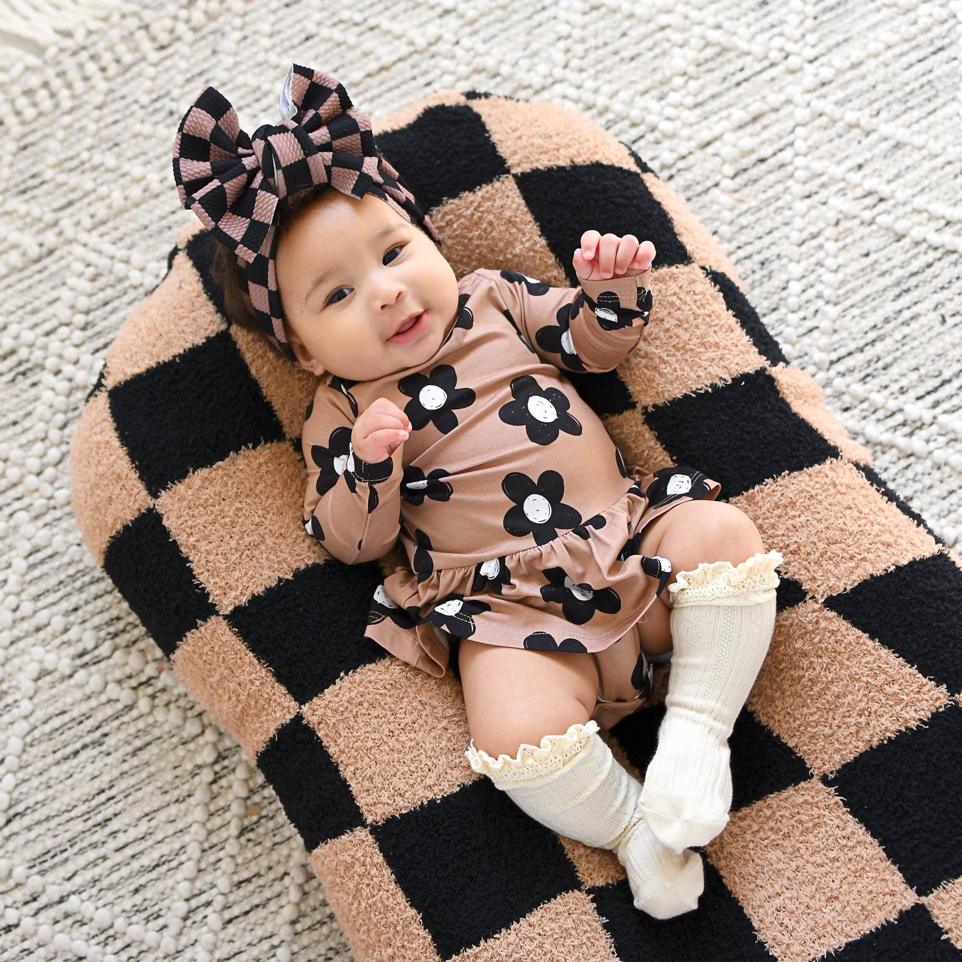 This beautiful headwrap is the perfect accessory for your sweet baby! Made from bullet fabric, a poly/spandex blend, it is super soft and stretchy!