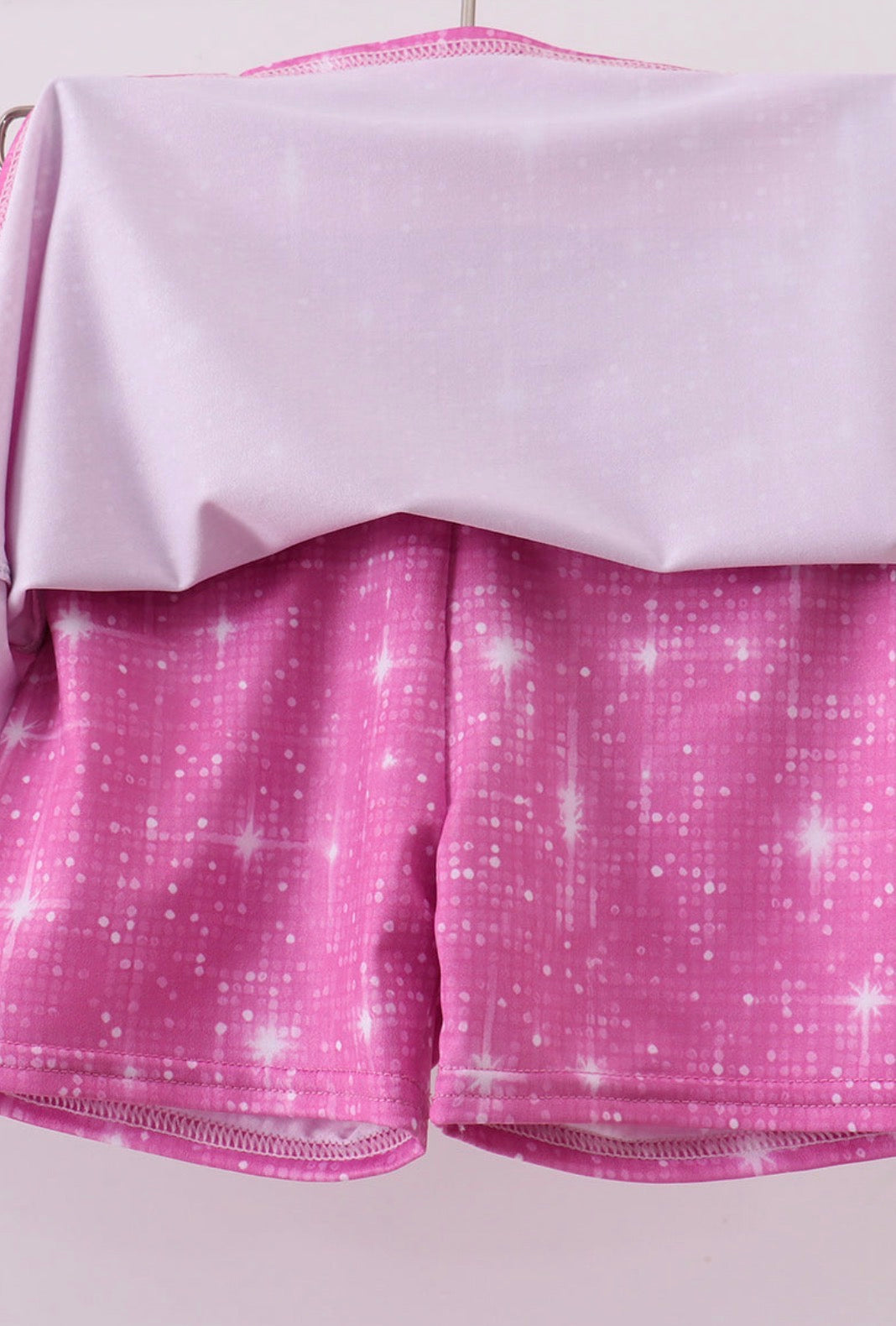 Sparkle and shine in this fabulous pink glitter skort set! Perfect for girls who love to stand out, this two-piece ensemble combines a glittery top with a matching skort for effortless style. The shimmering finish catches the light with every move, making it ideal for parties, performances, or everyday fun. Comfortable and eye-catching, this set lets your little one express her playful personality while staying active and confident.
