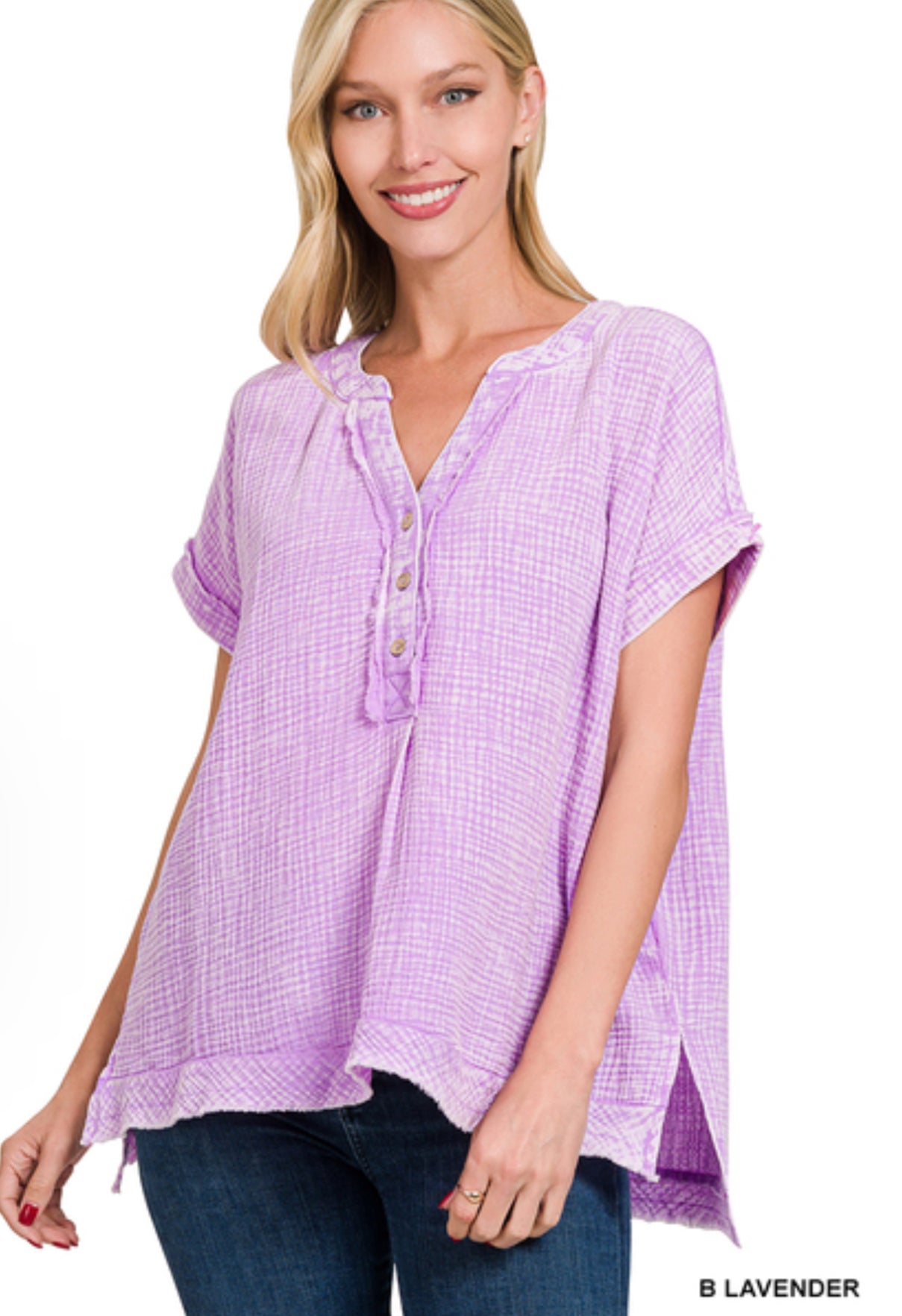 WASHED DOUBLE GAUZE 3/4 BUTTON HENLEY NECK SHORT SLEEVE SHIRT