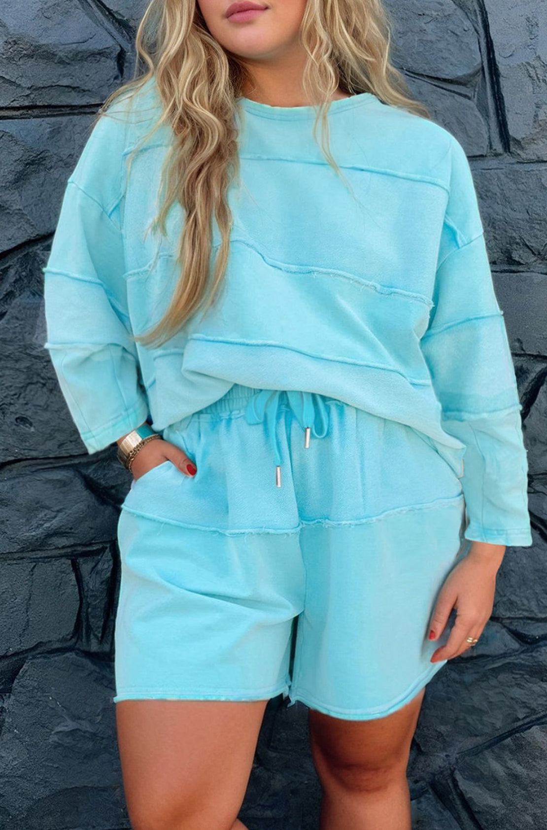 Solid color splicing adds a trendy twist to this casual plus size set.