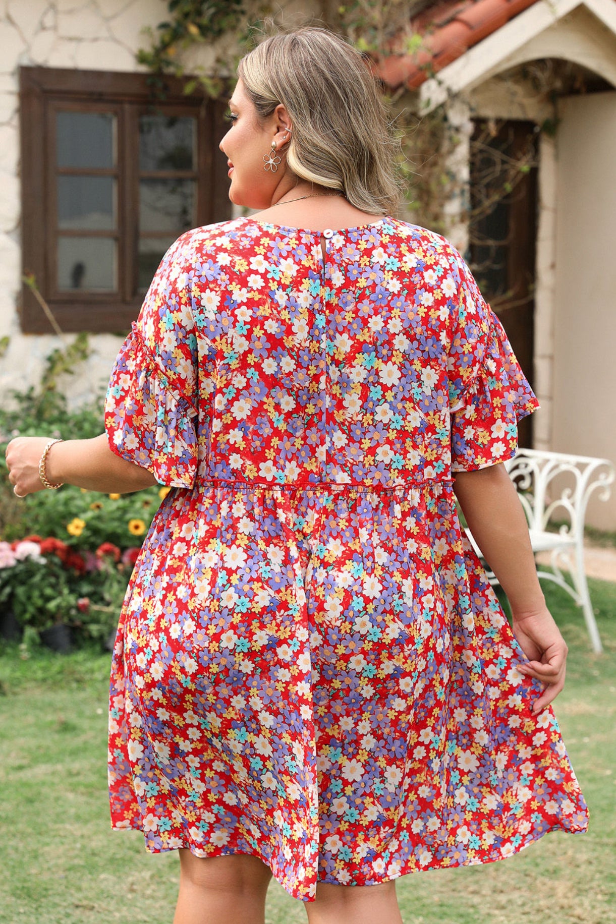 - Features a round neck, short ruffle sleeves, and a relaxed silhouette.