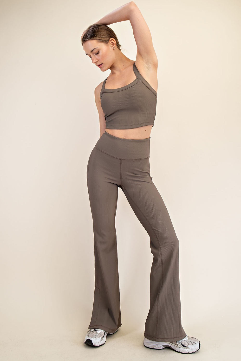 Flare leggings made from 2x2 ribbed nylon fabric, perfect for yoga, active wear, and everyday style. Soft, stretchy, and supportive with a flattering flared silhouette for effortless movement.