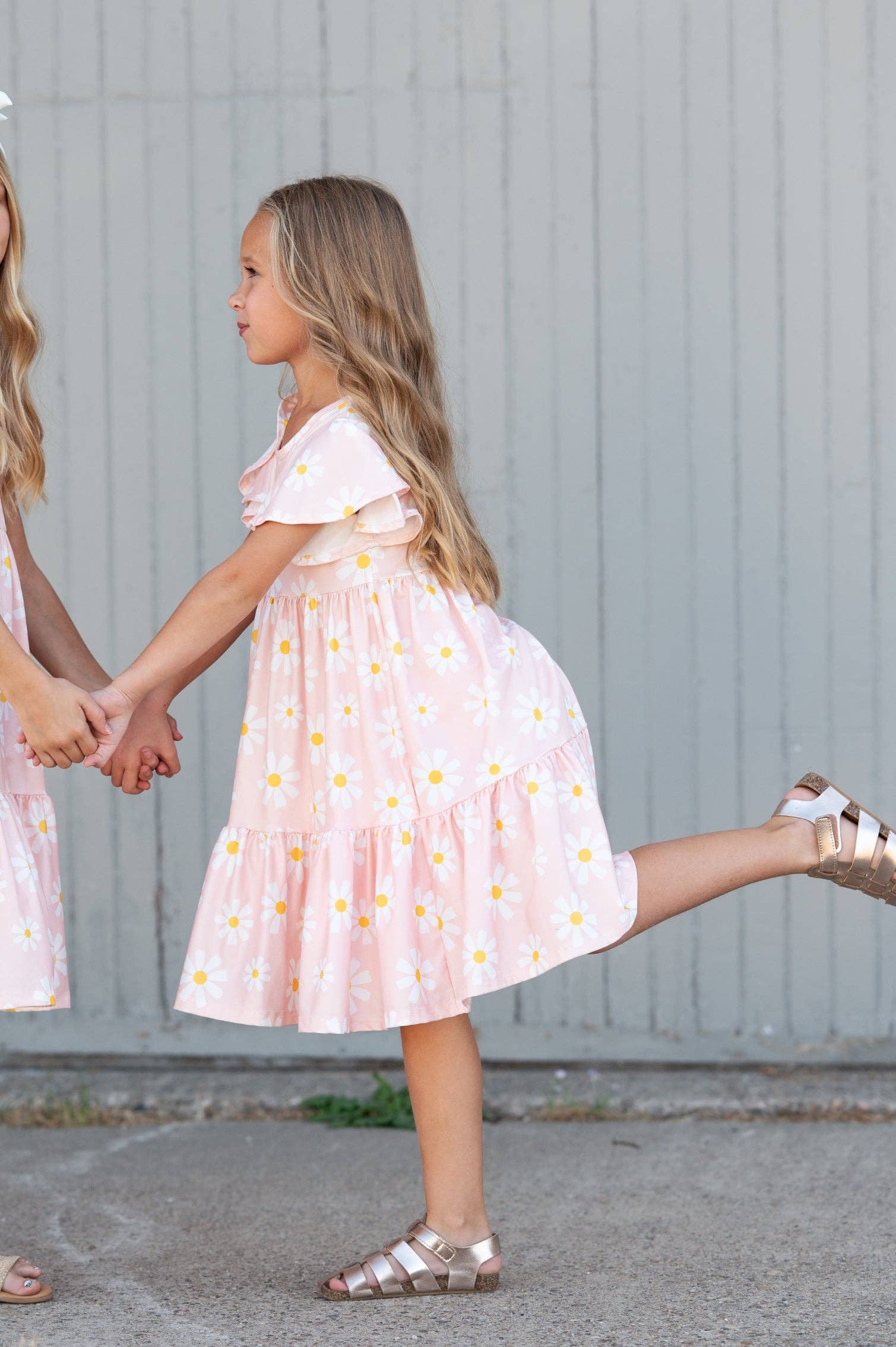 Introducing the Emma Daisy Dress, a charming addition to any little girl's wardrobe. This pink twirl dress boasts a delightful white spring daisy print, while the flutter sleeves add a touch of whimsy. Made with high-quality materials, it's perfect for swirling and twirling all day long. Spring, Summer, Easter