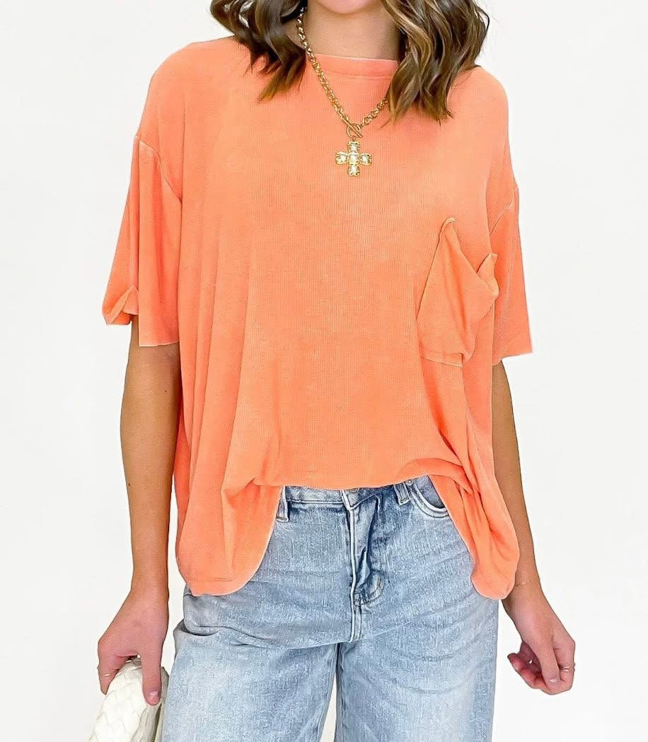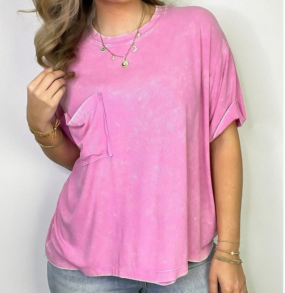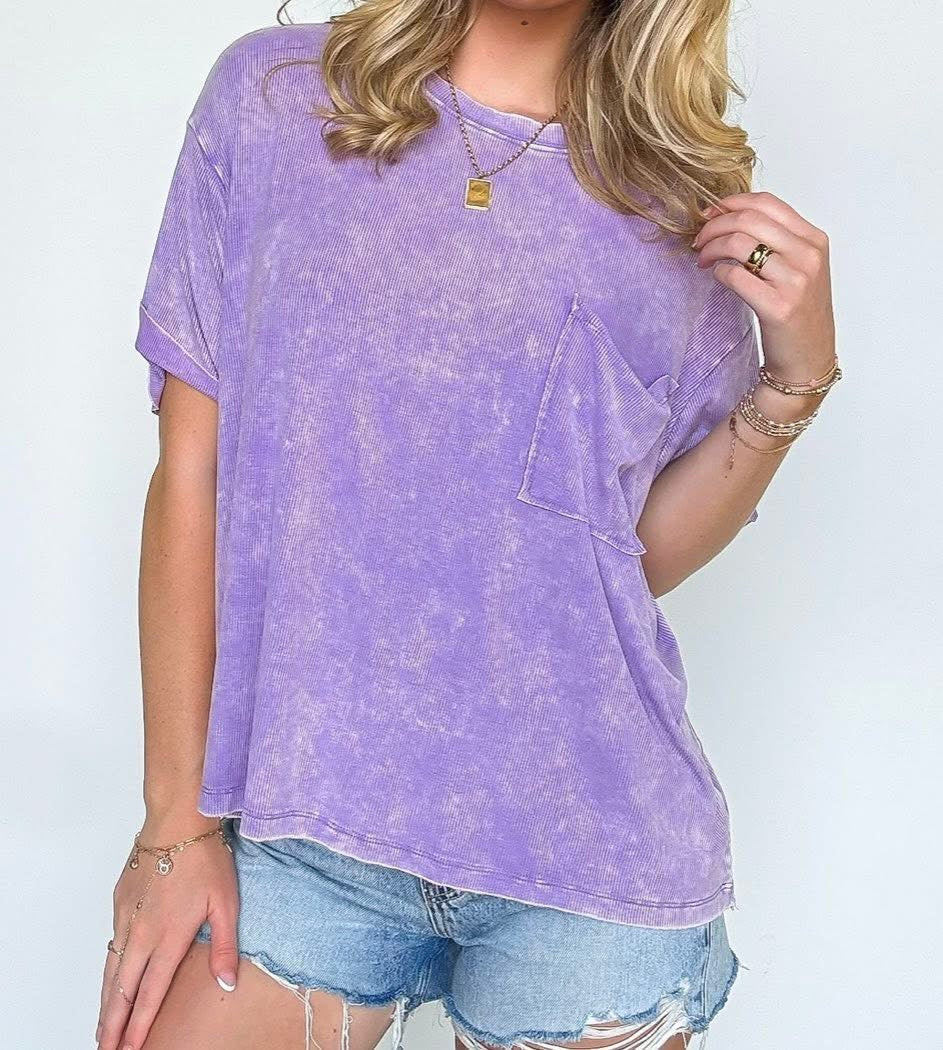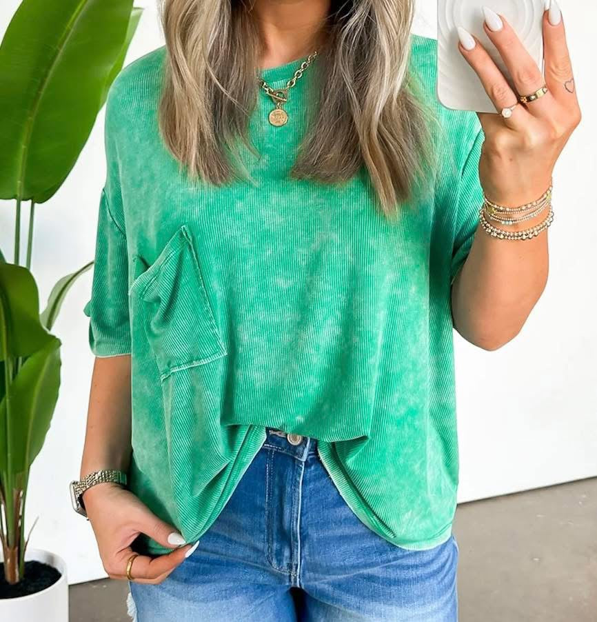WASHED RIBBED CUFFED SHORT SLEEVE ROUND NECK TOP
