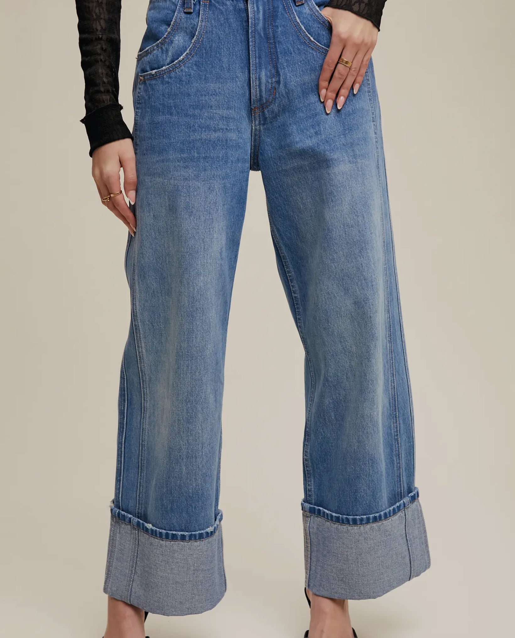 - Model is 5' 7.5" 34-24-34 and wearing a size Small An everyday statement jean with exaggerated cuffs and a laid-back vintage charm.