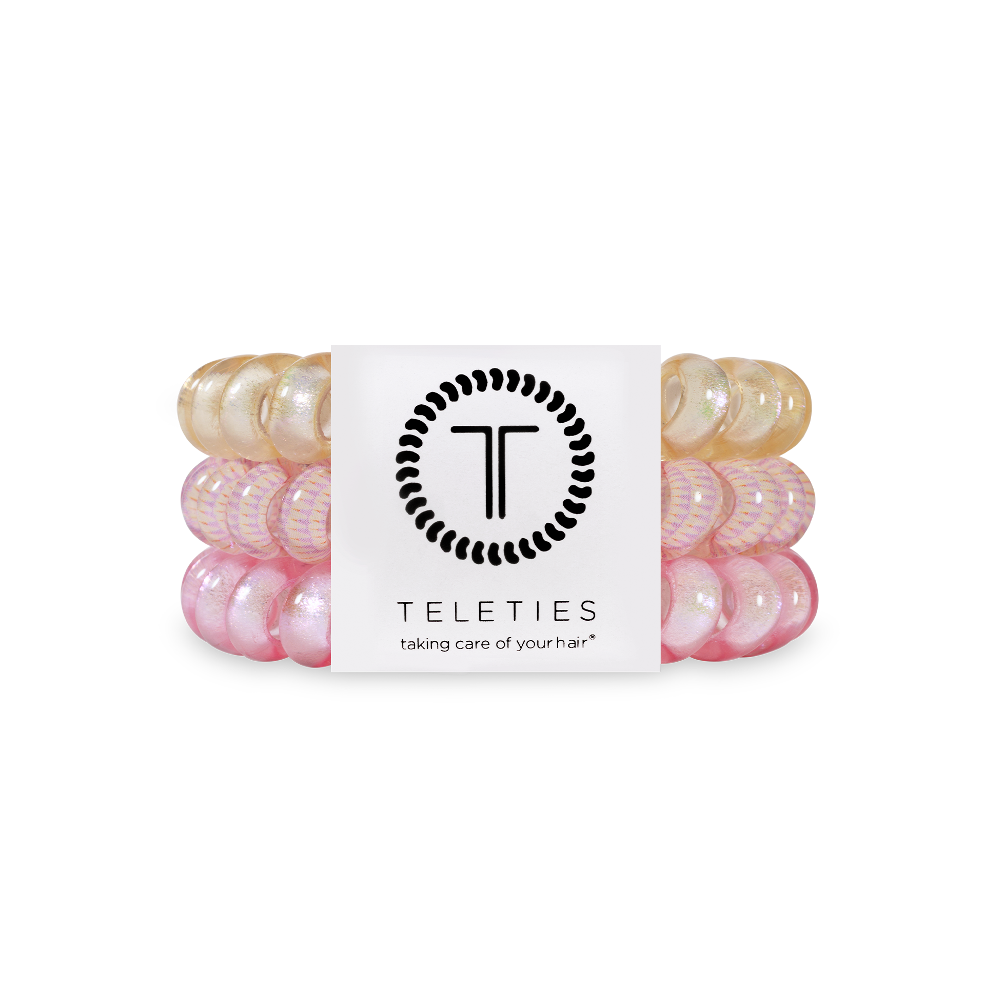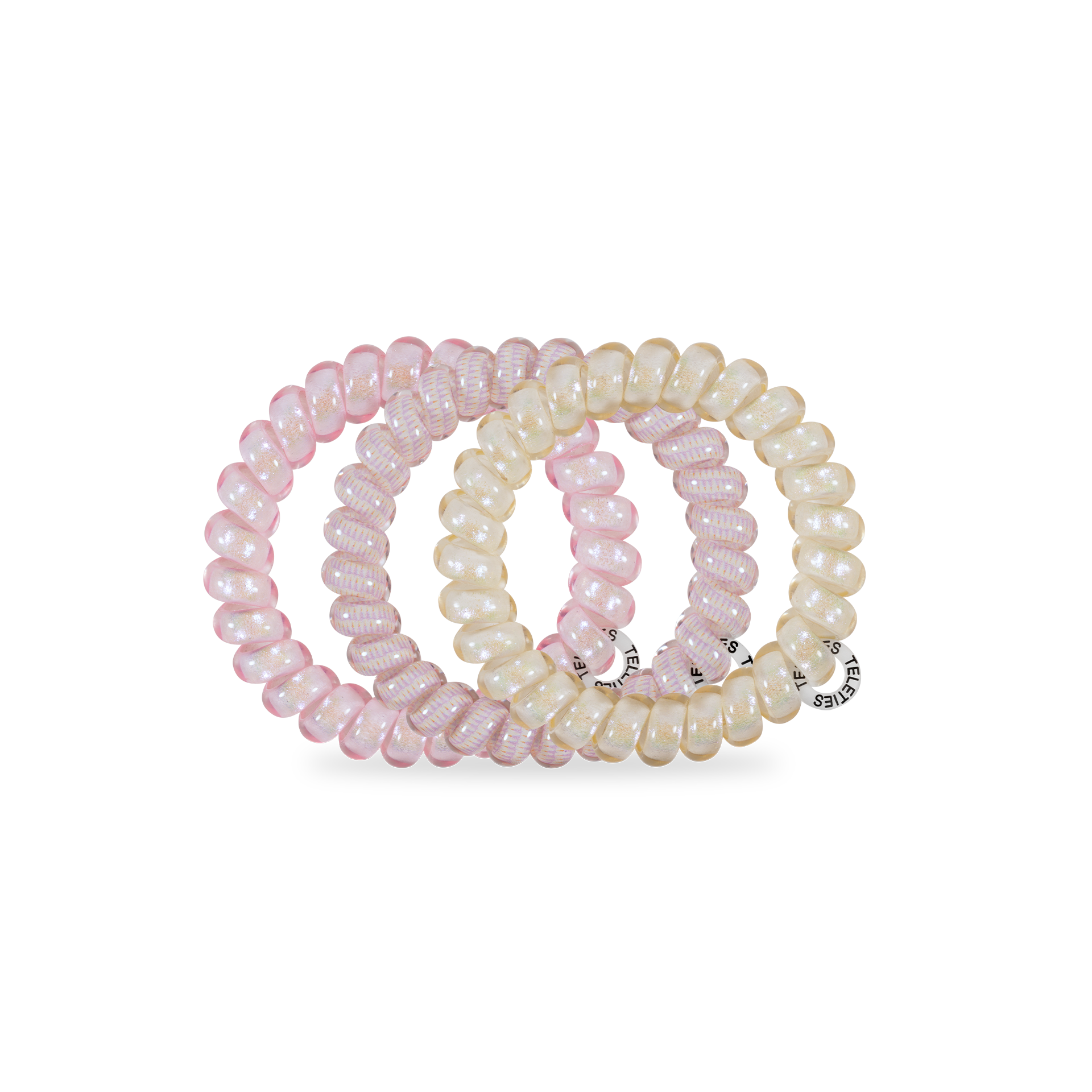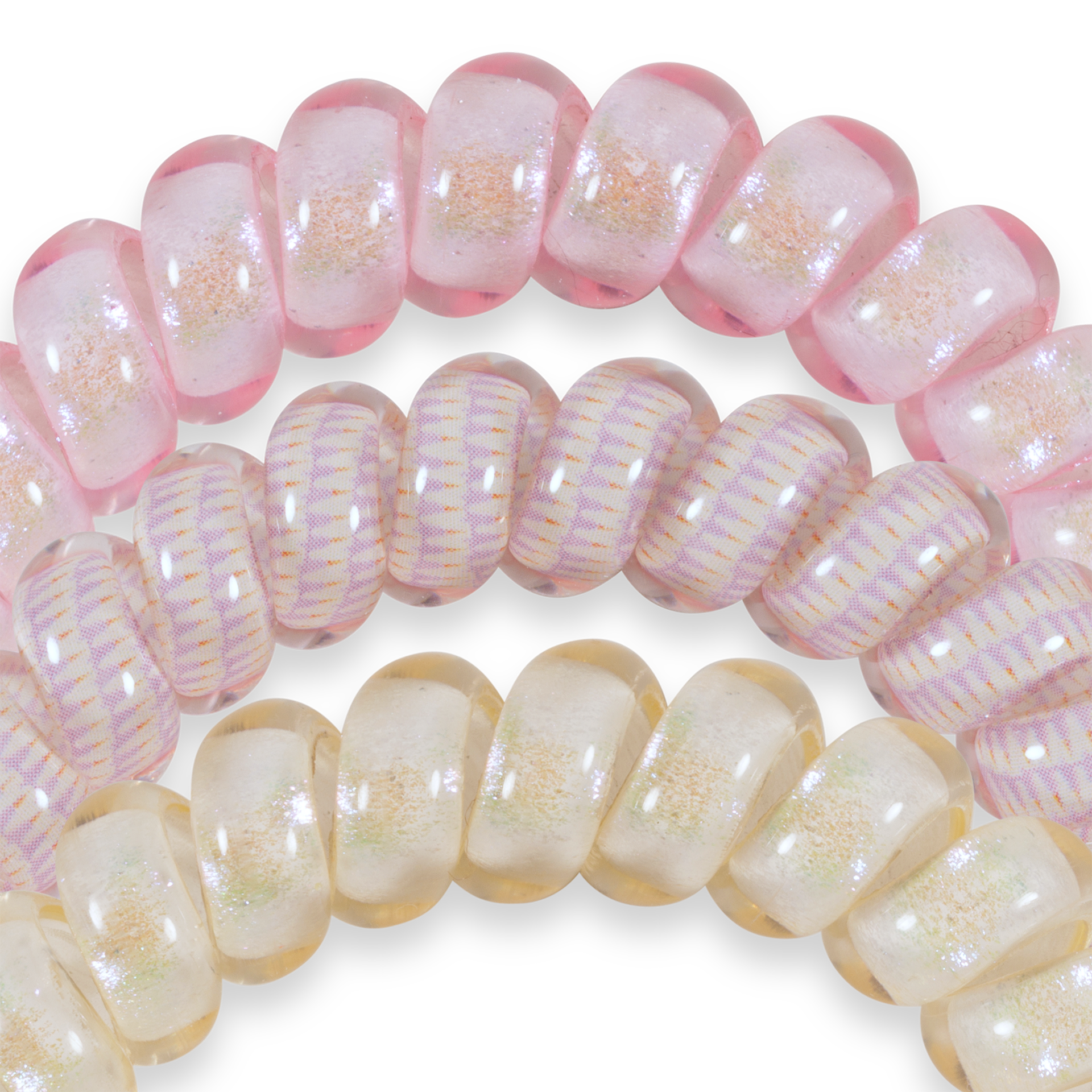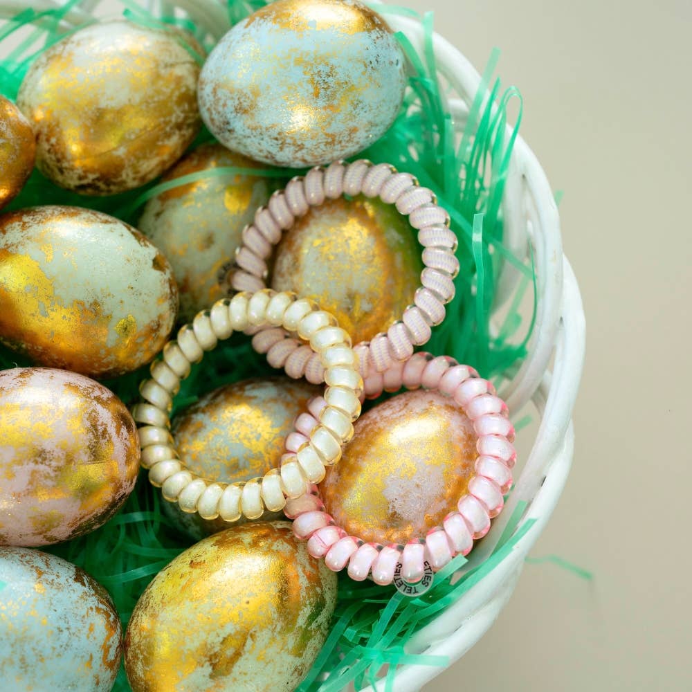 Meadow Mist Large Hair Ties in Pink and Yellow Shimmer offer a strong grip without damage, doubling as a chic wrist accessory when not in use. Your new favorite hair essentials all year round.