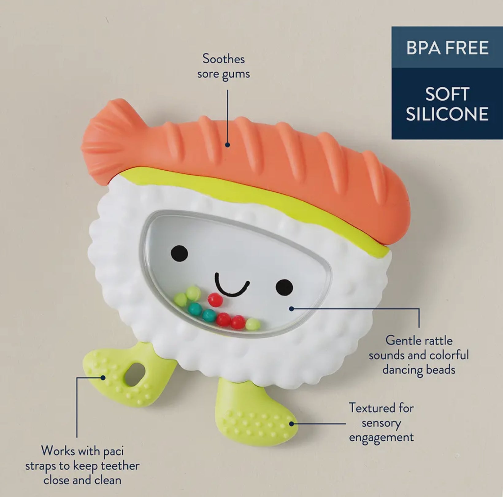 Shake, rattle & teethe! Get ready for triple the fun with the Sweetie Shake Plus™. The soft silicone teether, colorful dancing beads and gentle rattle sounds are perfect for sensory seekers tiny to toddler.