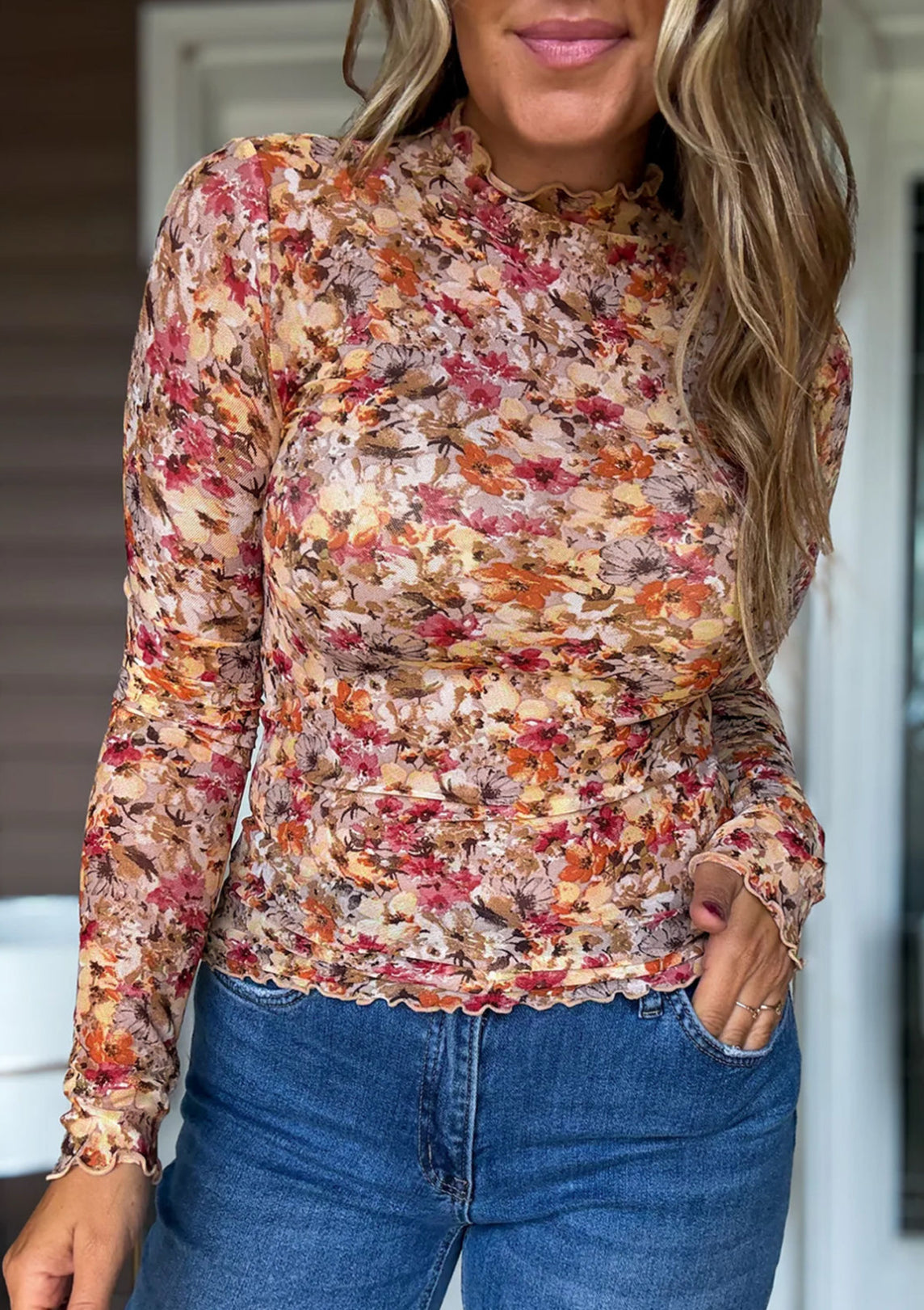 This sheer long sleeve top is lightweight and layered with charm.