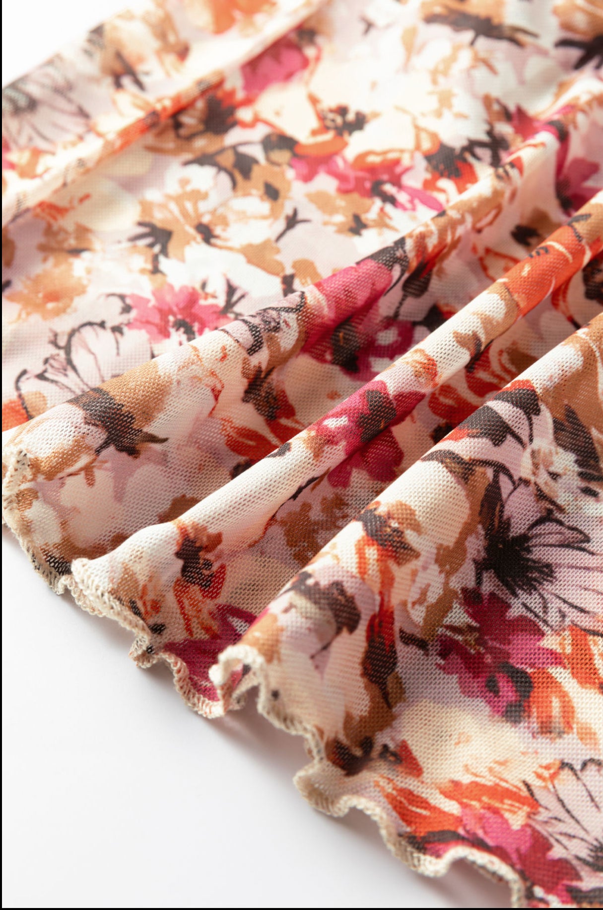 Featuring romantic floral mesh and soft, swirled lettuce trim.