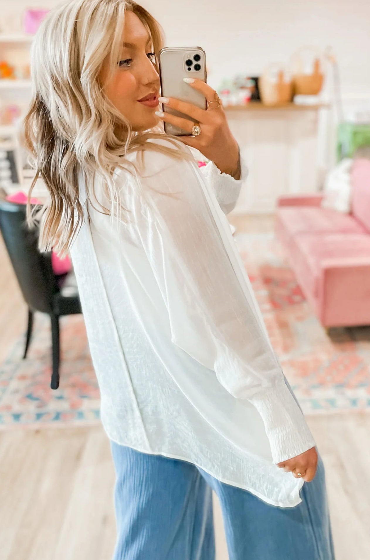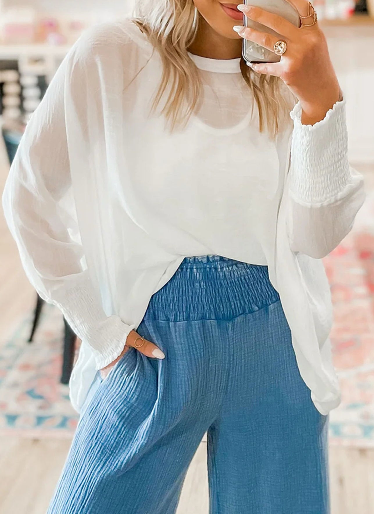 Smocked cuffs create subtle volume and stylish wrist detail.