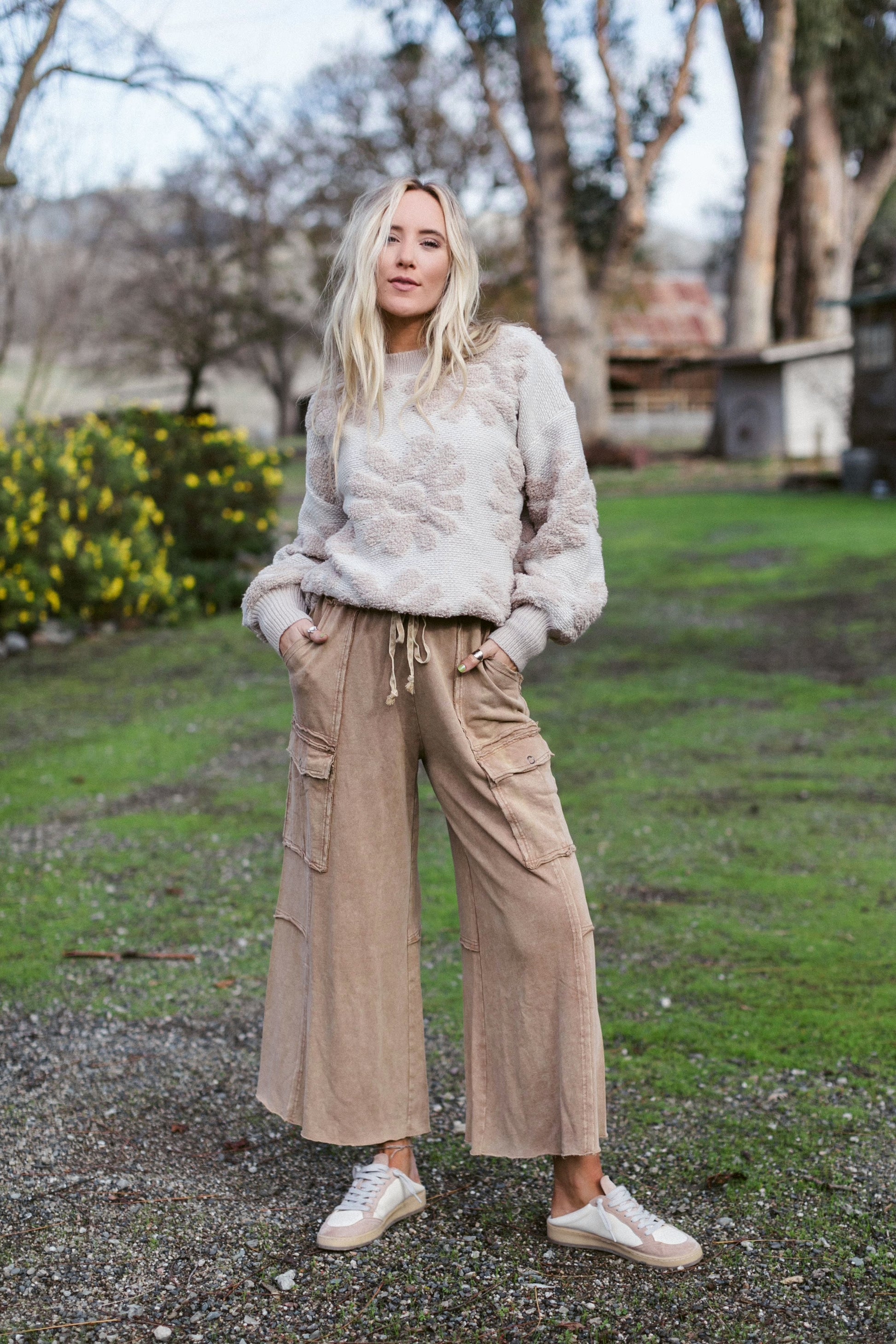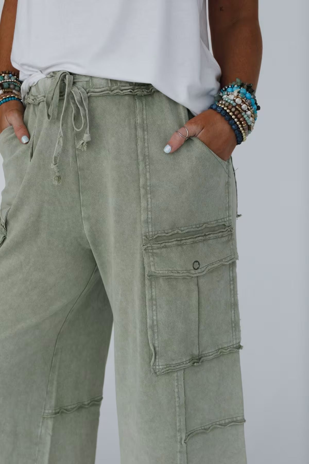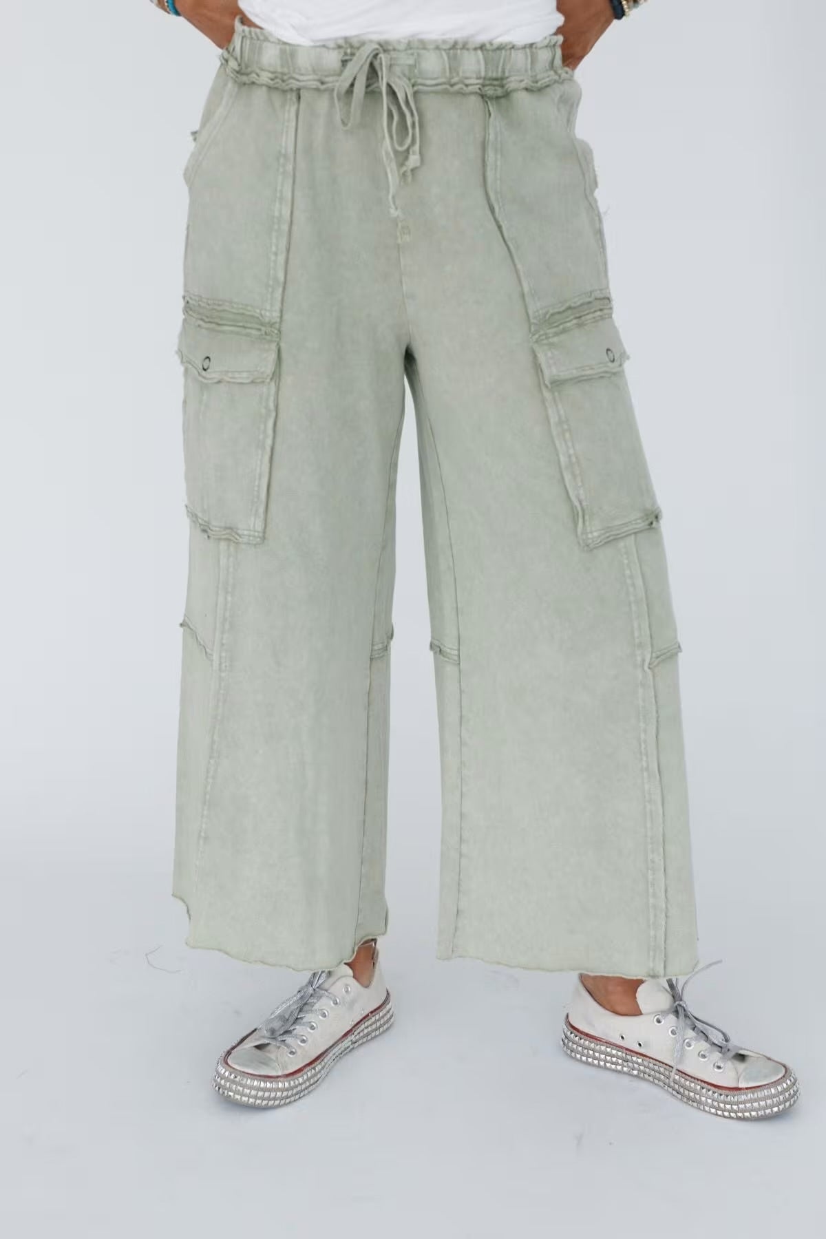 FEELING GOOD UTILITY MINERAL WASHED WIDE LEGS TERRY KNIT CARGO PANTS