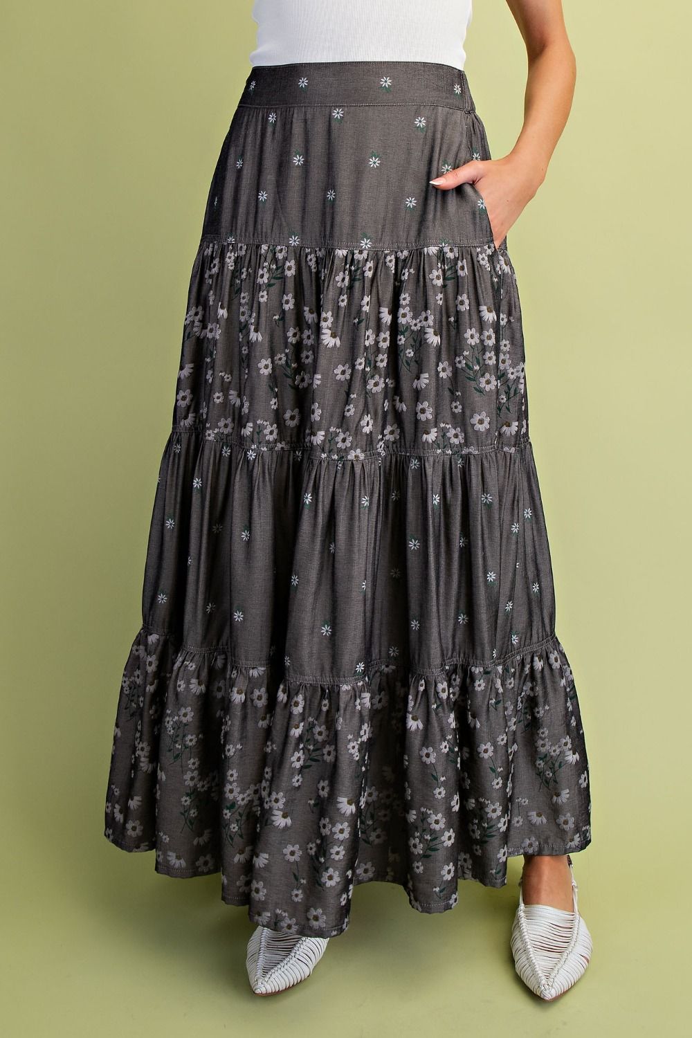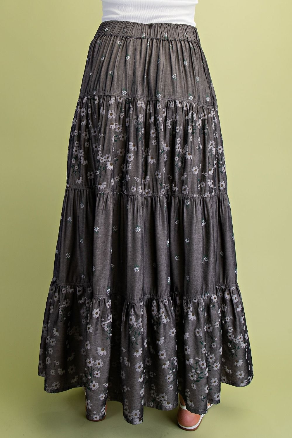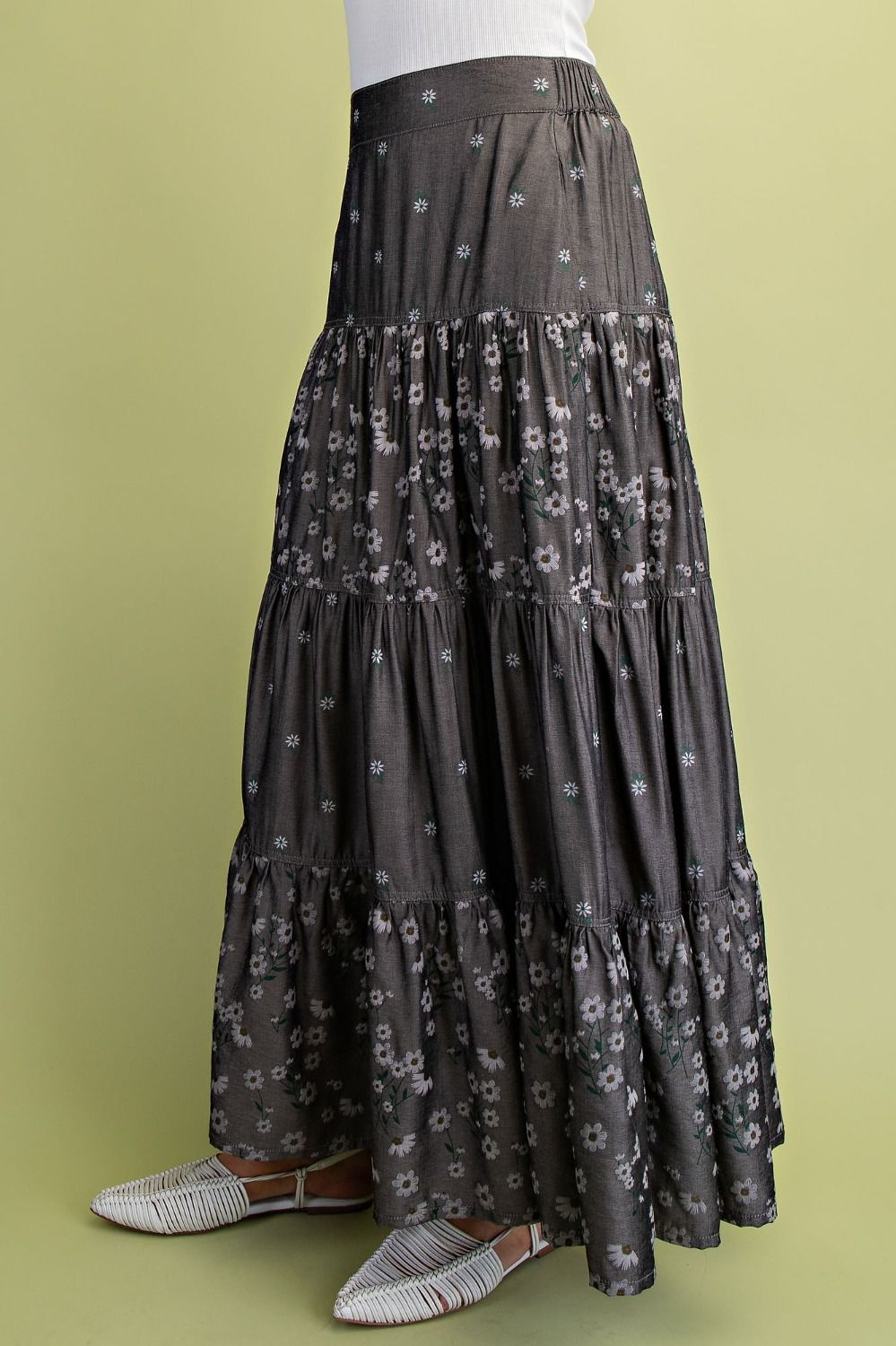 Description: PRINT CHAMBRAY TIERED MAXI SKIRT