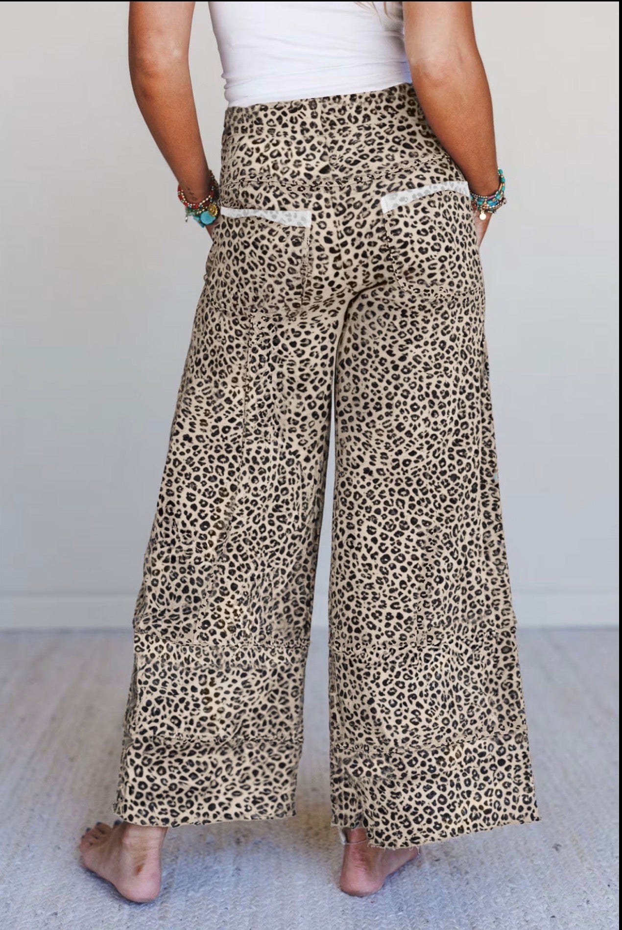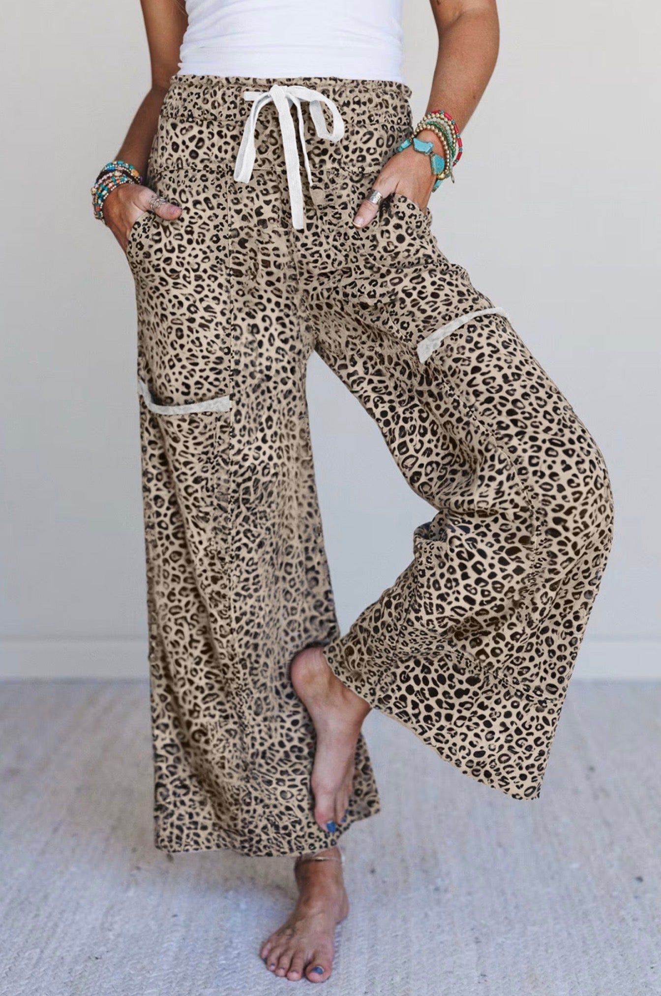 Soft terry knit fabric offers cozy comfort in these animal print wide leg pants.