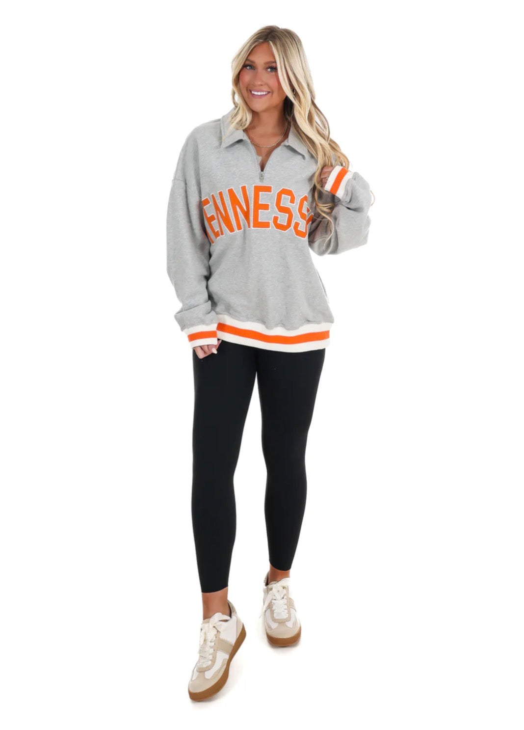 Introducing the Tennessee Stripe Elastic Banded Half-Zip Pullover—your new go-to for effortless style! This collared pullover features a playful half-zip front, oversized silhouette, and those coveted drop-shoulder sleeves for maximum comfort. The Tennessee embroidered letters add a charming regional touch, while elastic banded details keep everything in place. Perfect for layering or wearing solo, this pull-over sweatshirt blends casual cool with just the right amount of personality. Cozy never looked so good!