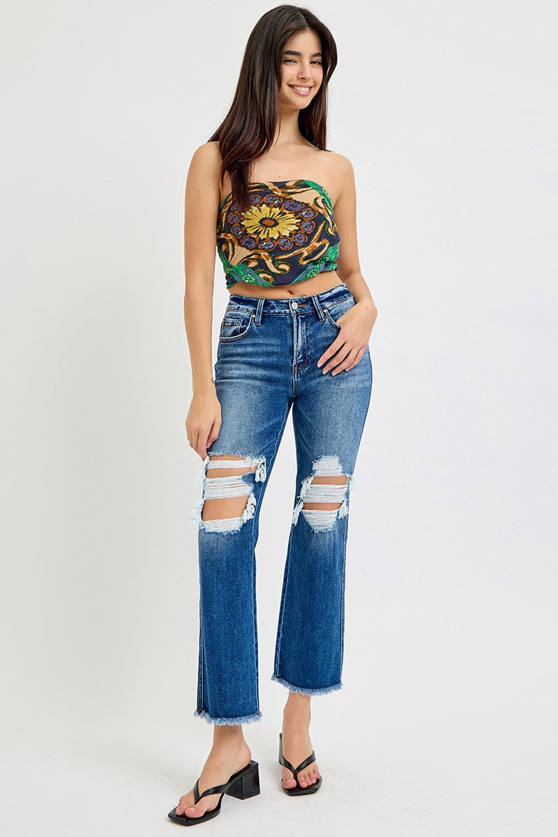 The Dark Mid-Rise Distressed Crop Jeans bring together a perfect blend of edgy and casual style. Featuring a mid-rise waist that sits comfortably below the natural waistline, these jeans provide a relaxed fit with a flattering silhouette. The dark wash adds a touch of sophistication, while the distressed detailing, including frayed hems and subtle rips, gives them a bold, lived-in look. The cropped length, hitting just above the ankle, adds a modern touch, making these jeans perfect for showing off your favorite sneakers or heels. Versatile and chic, they offer an effortlessly cool vibe for everyday wear.