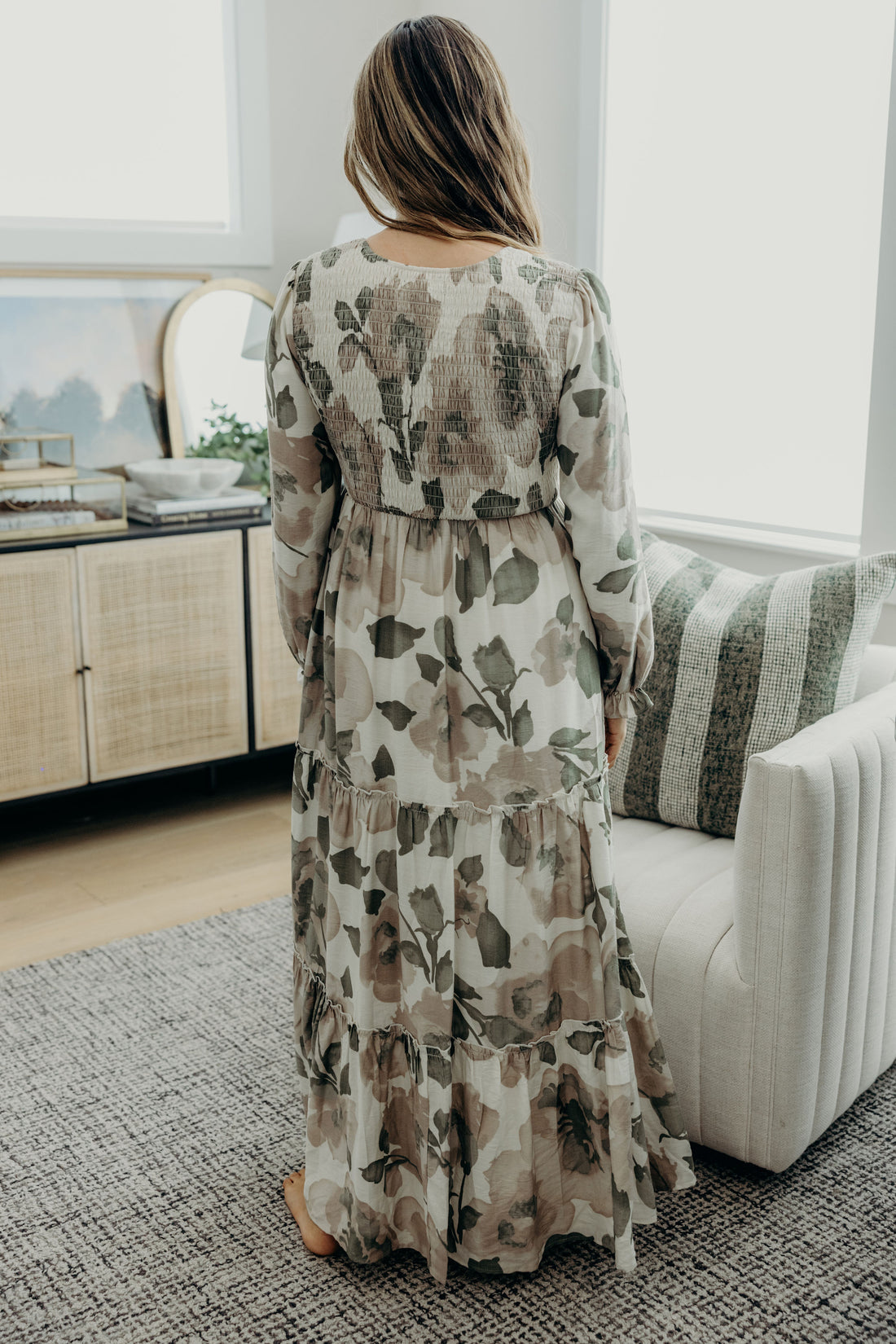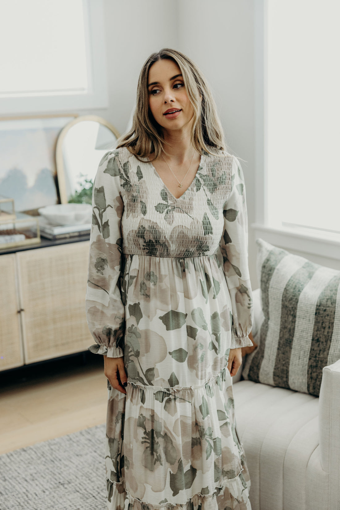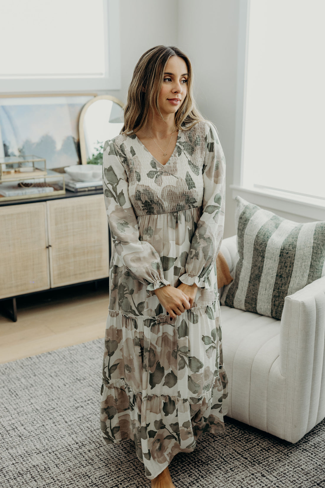 Maxi dress with a tiered skirt, smocked bodice, v neckline and long sleeve elastic wrist.