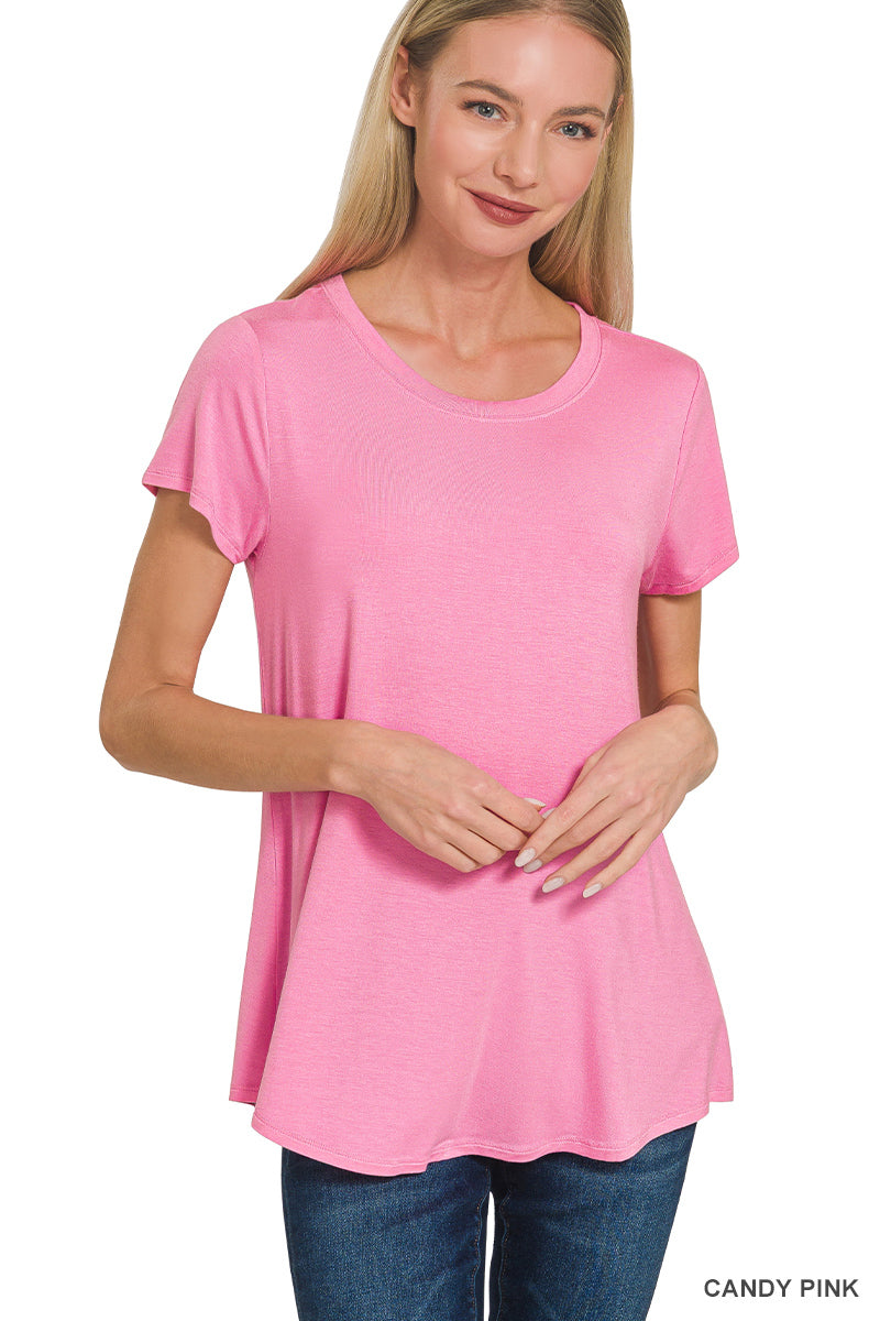 FLOWY ROUND HEM RAYON SHORT SLEEVE TOP