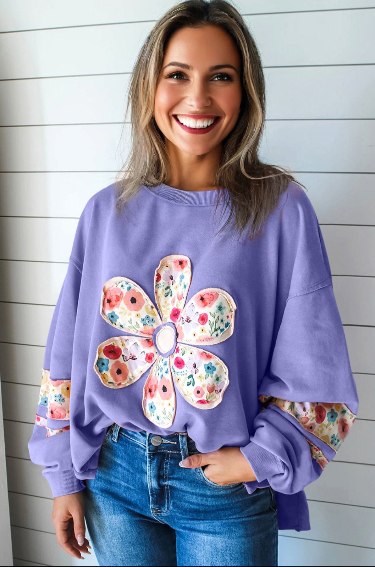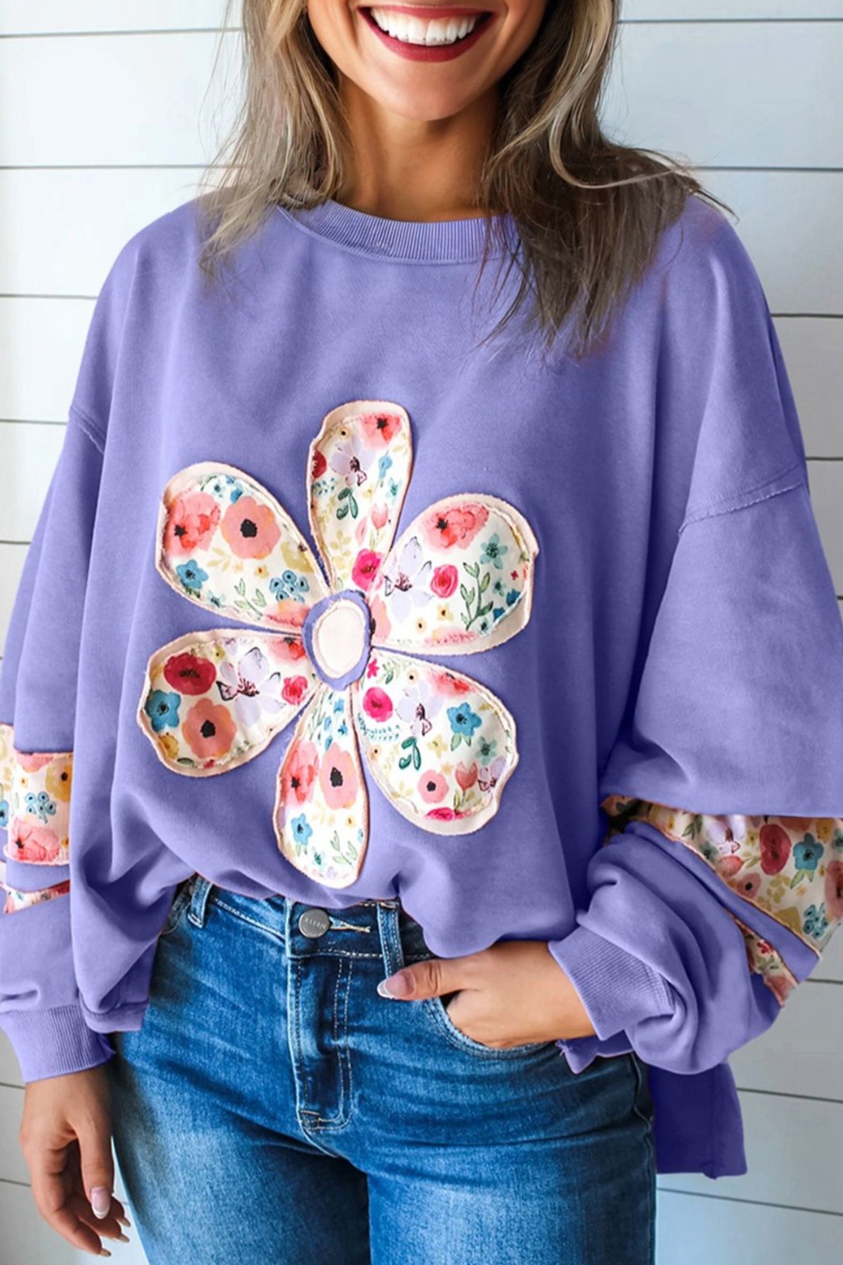 The floral applique graphic adds feminine charm to this pullover top.