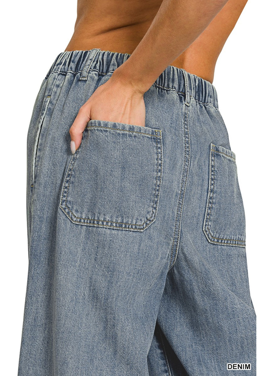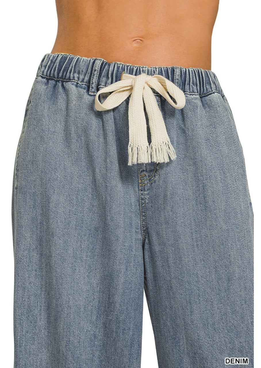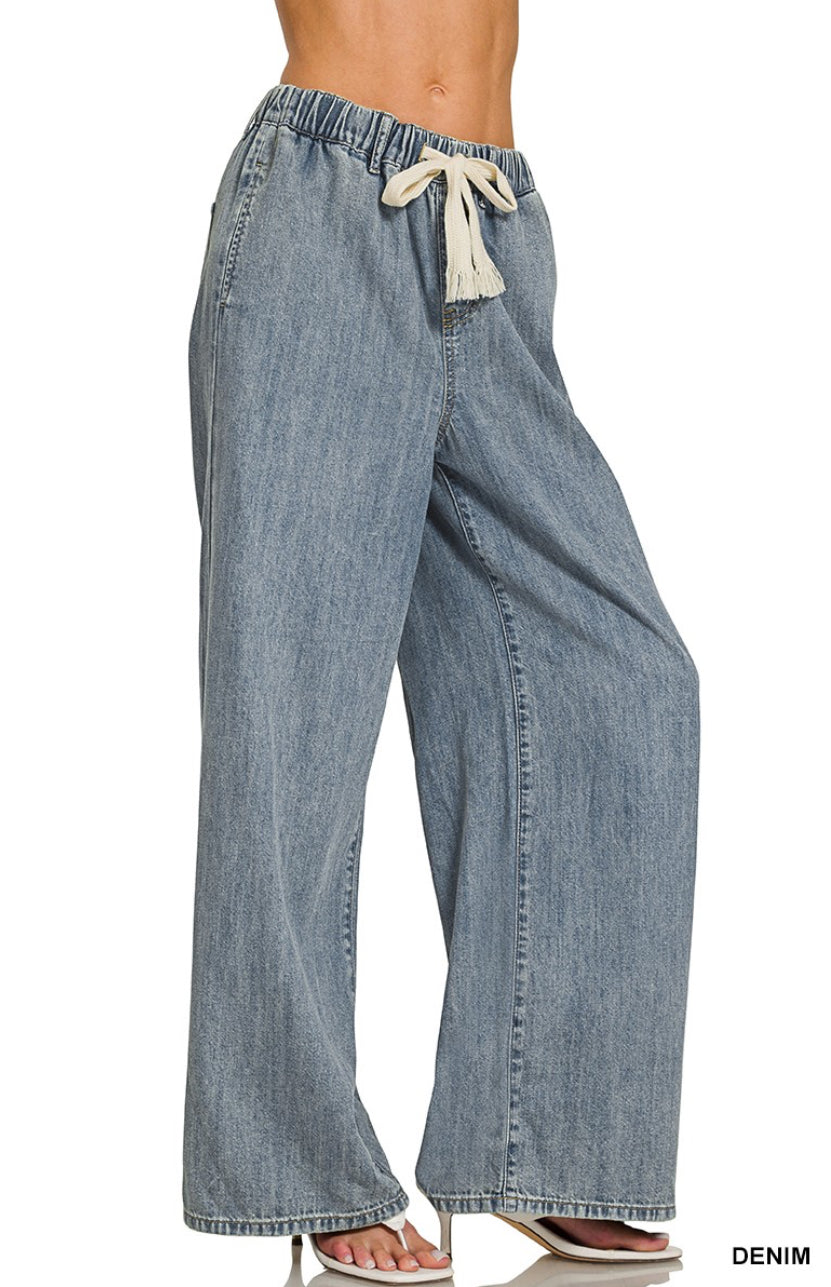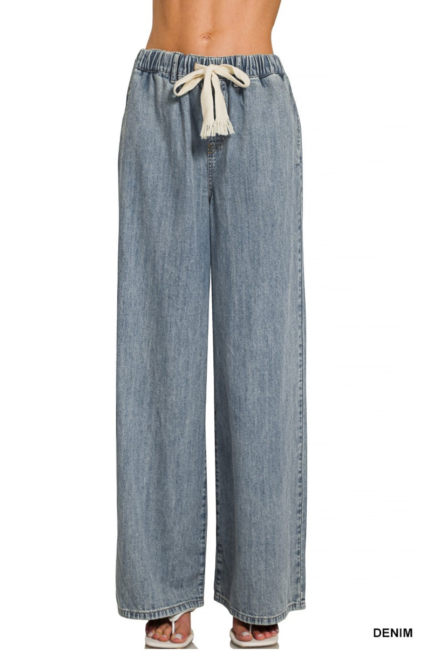 WIDE LEG DRAWSTRING ELASTIC WAISTBAND DENIM PANTS